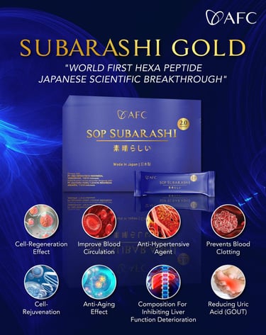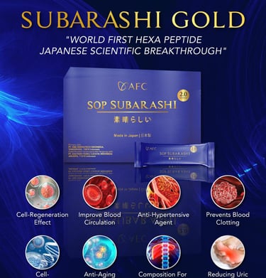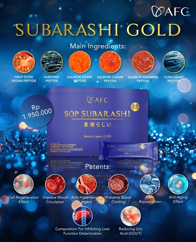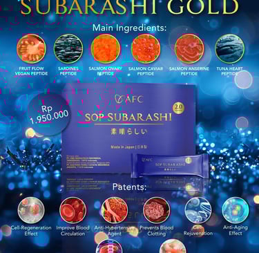 SOP Subarashi adalah produk Triple Peptide pertama di Jepang yang memiliki bahan aktif utama yaitu Marine Placenta dari ikan Oncorhynthus Keta Salmon di Hokkaido, Sardine Peptide dan Vegan Peptide (Fruit Flow) dan juga 7 bahan aktif lainnya.